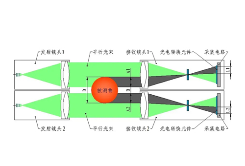 圖中2套發(fā)射鏡頭分別發(fā)射出平行光射向2套接收鏡頭,通過接收鏡頭內(nèi)的透鏡使平行光束在光電轉(zhuǎn)換元件CCD芯片上成像。當(dāng)2束平行光內(nèi)放入被測(cè)物時(shí),在光電轉(zhuǎn)換元件的像上就會(huì)出現(xiàn)陰影,設(shè)其寬度分別為L(zhǎng)1、L2。經(jīng)過對(duì)光電轉(zhuǎn)換元件發(fā)出的電信號(hào)的處理和計(jì)算可以得出L1、L2所對(duì)應(yīng)的尺寸A1、A2,A1加A2再加上兩個(gè)鏡頭之間的凈間距B即可得出被測(cè)物的尺寸D。